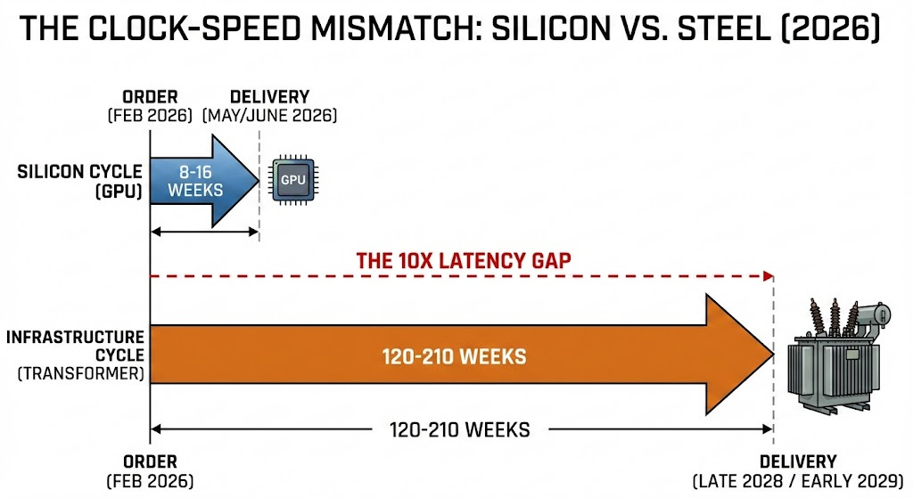 The Latency Delta: As of February 2026, flagship AI GPU lead times (NVIDIA H200/B200) have stabilized at 8–20 weeks. Conversely, Large Power Transformers (LPT) are quoting 80 to 210 weeks. We are attempting to plug a 16-week “Brain” into a 144-week “Heart” [1, 2].