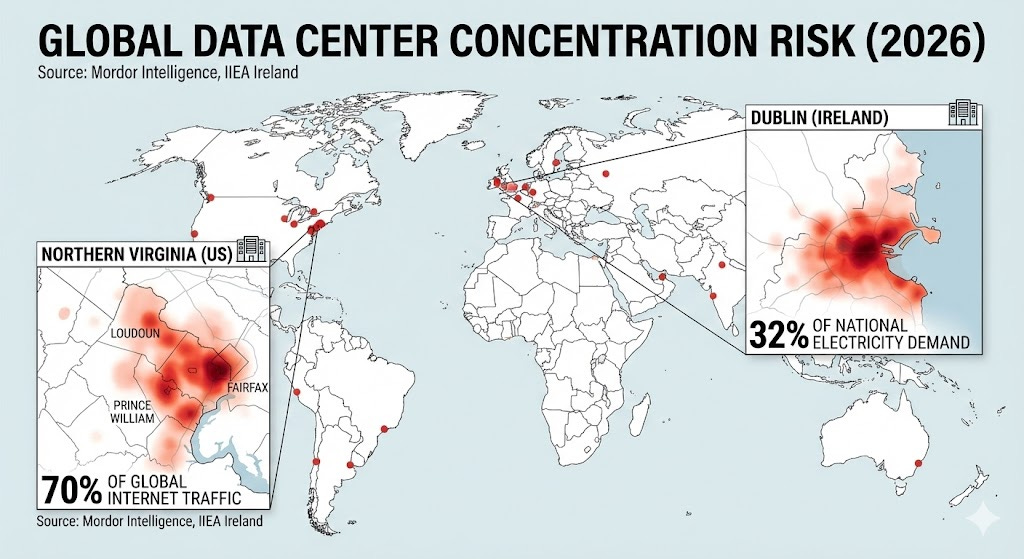 Northern Virginia: Roughly 70% of global internet traffic flows through three counties here. Data centers are projected to consume 46% of Virginia’s electricity by 2030, turning the region into a massive single point of failure [13].